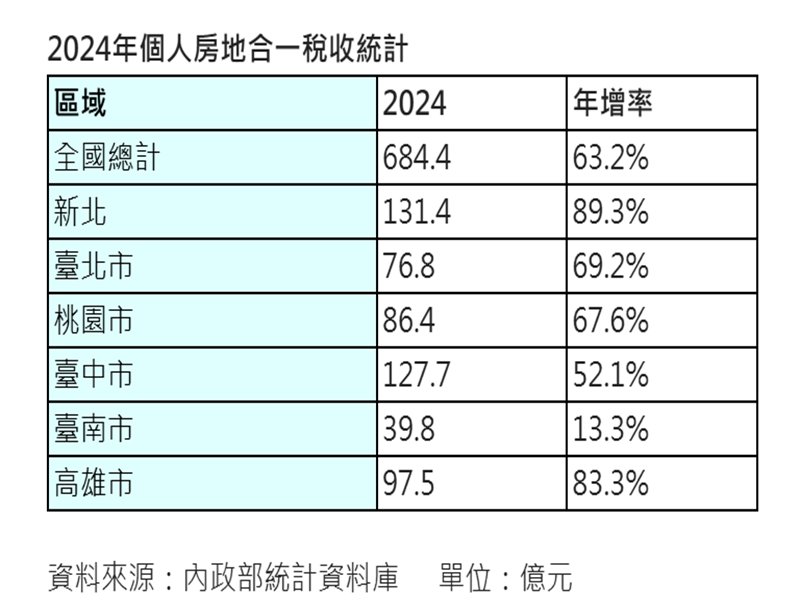 若以區域來看,個人房地合一稅收已經7連霸的台中市,2024年則由新北市奪冠,個人房地合一稅收131.4億元,年增89.3%,反映新北房市過去一年出售時價格大漲,曾敬德表示,新北市許多重劃區房價上漲,加上交易量大帶動稅收增加。
