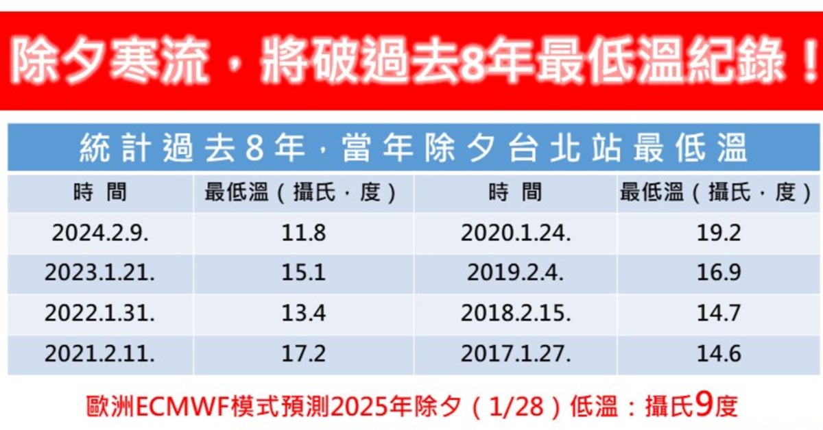 不過,農曆春節即將到來,不少家庭相當關心天氣變化,氣象專家林得恩在臉書「[林老師氣象站」中示警,「除夕寒流,將破過去8年最低溫紀錄!」,林得恩指出,根據歐洲最新值模式模擬結果顯示,過年前還會有一波超強冷氣團將南下,除了強度有機會直接挑戰今年首波的「寒流」外,影響時間也將再延長。