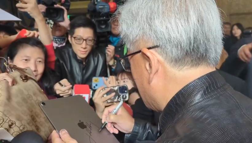 輝達執行長黃仁勳展現一貫親切態度,幫粉絲簽名。(圖/東森新聞)