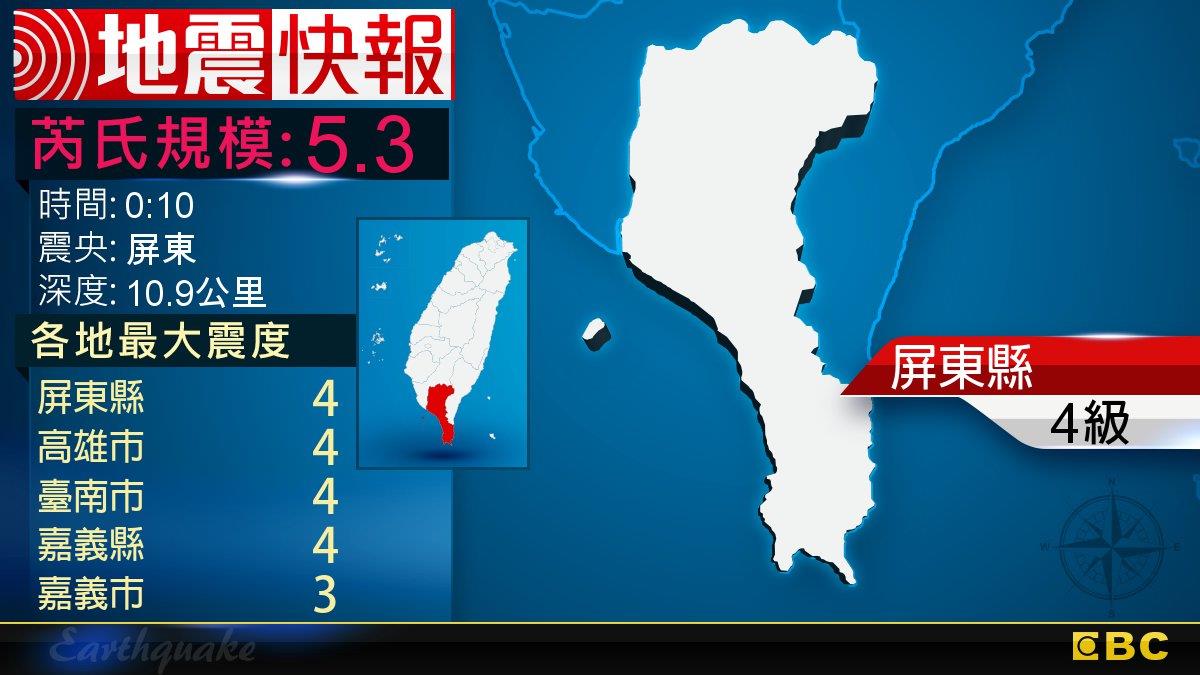 地牛翻身!0:10 屏東發生規模5.3地震