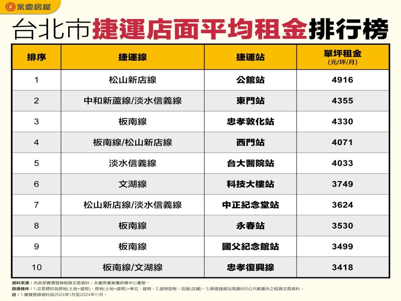 台北市捷運店面平均租金排行榜。(永慶提供)