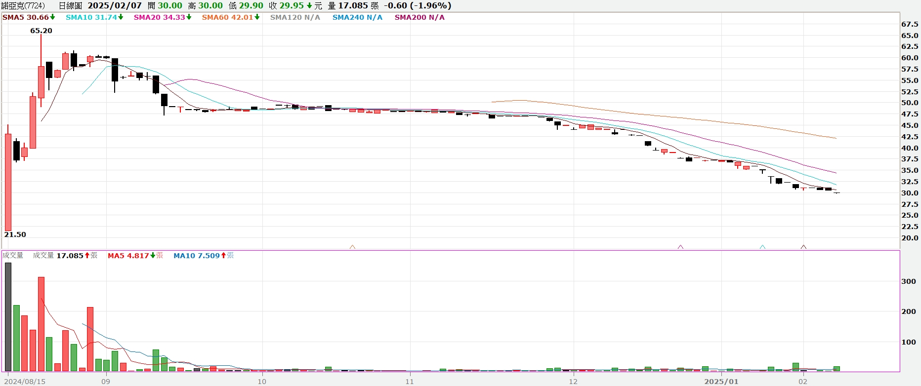觀察諾亞克股價,自在興櫃掛牌第5日個交易日創下65.2元的歷史高價後,隨即一路走跌,今日股價以30元開出,最低下探29.90元,至截稿前報29.95元,跌0.6元,跌幅1.96%,成交量僅17.085張,不過已是近5交易日最大量。