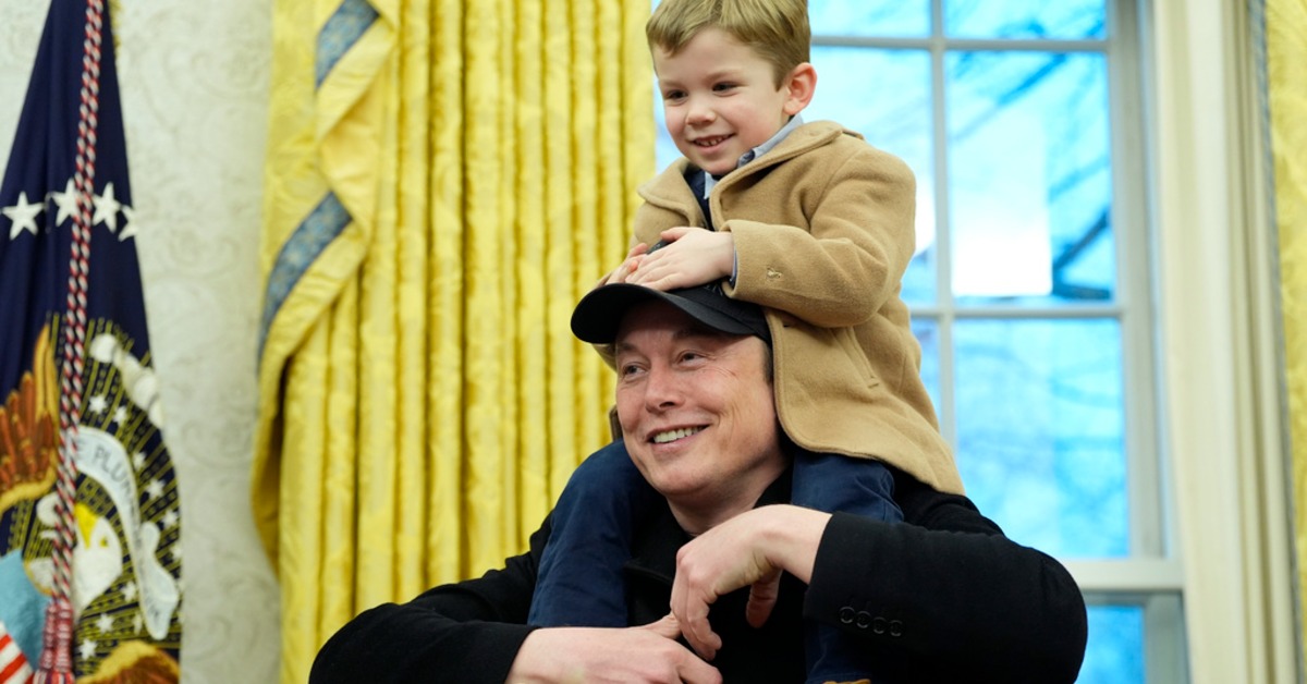 億萬富豪馬斯克與5歲兒子X一起在美國總統的橢圓辦公室。(圖/美聯社)