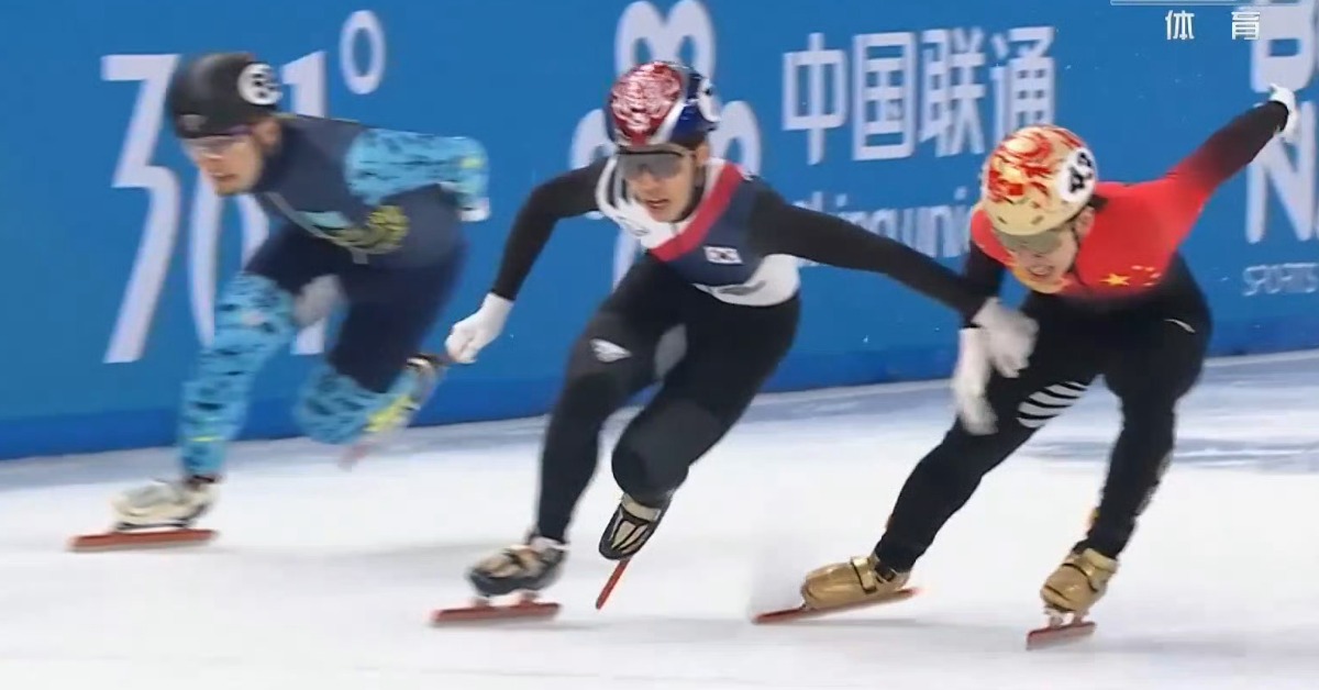 在短到速滑5000公尺接力中,韓國隊伸手阻擋中國隊選手,導致中國隊的林孝埈直接摔出場外。(圖/翻攝自微博@收留競技運動人眼淚洗面襟)