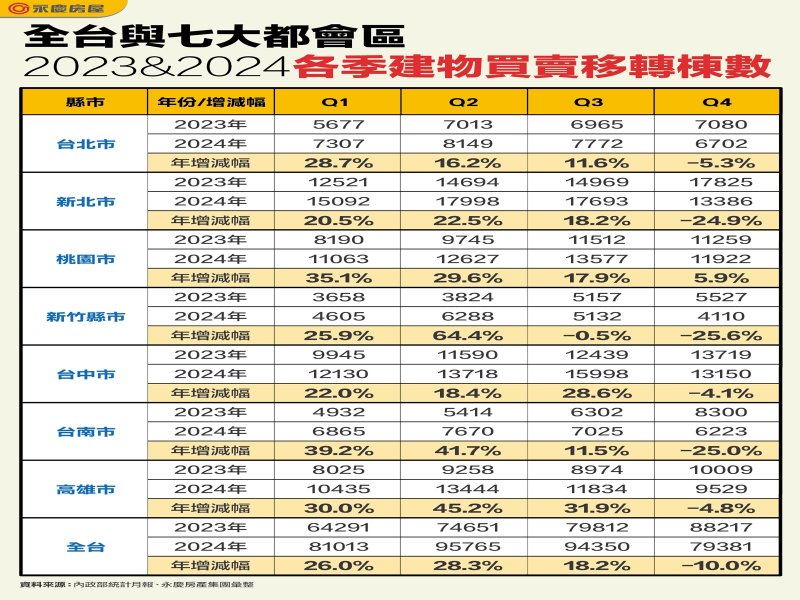 全台與七大都會區2023&2024各季建物買賣移轉棟數。(永慶提供)