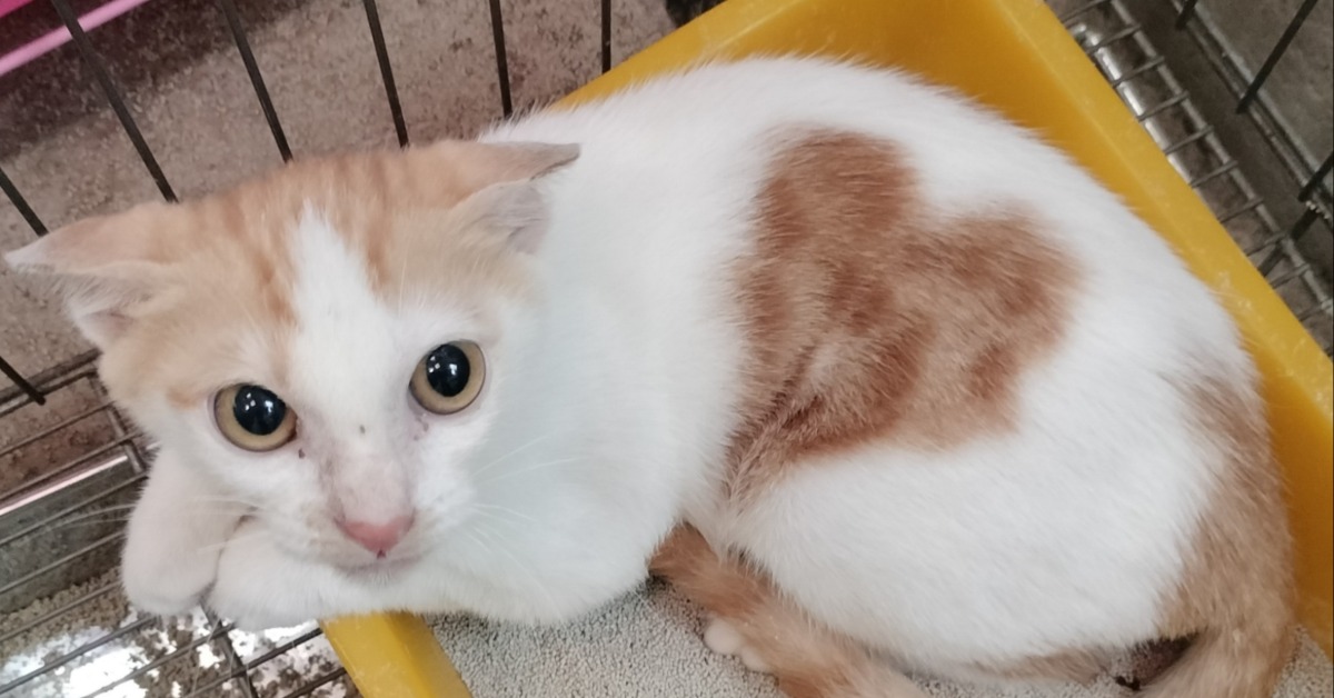 新北市動保處表示,日前救援的「愛心貓」,全身髒污且皮膚病導致嚴重掉毛,經過體內外驅蟲、除蚤及醫療照護,再由動保員細心清潔後,才驚喜發現牠毛色上的心型印記,彷彿是大自然特意為牠準備的情人節禮物,而「愛心貓」也在浪漫的情人節前夕,幸運地被認養,為這段奇妙的緣分畫下美好句點。