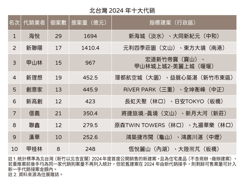 住展雜誌統計排行北台灣2024年十大代銷在住宅產品接案狀況(不含商辦、廠辦建案),依接案量統計依序為海悅、新聯陽、甲山林、新理想、創意家、新高創、信義、聯鑫、漢華、甲桂林,接案量介於248至1694億元,總接案量來到6523.3億元,相比2023年增27.2%。