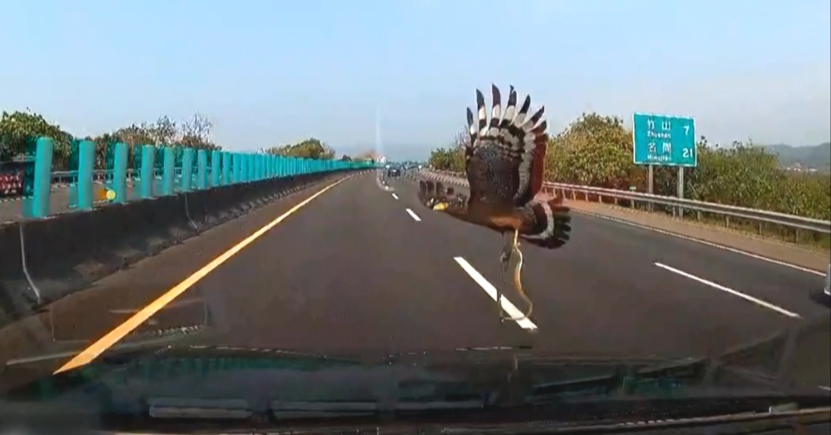 在道路上遇到這種意外的機率應該超級小,但有駕駛還真的遇到了。一名駕駛在在國道開車時,竟然跟一隻抓著蛇正在飛的的老鷹迎面對撞,瞬間碰一聲超大聲,讓車內所有人都嚇了一跳。駕駛無奈,幸好玻璃沒破,這段畫面也曝光。
