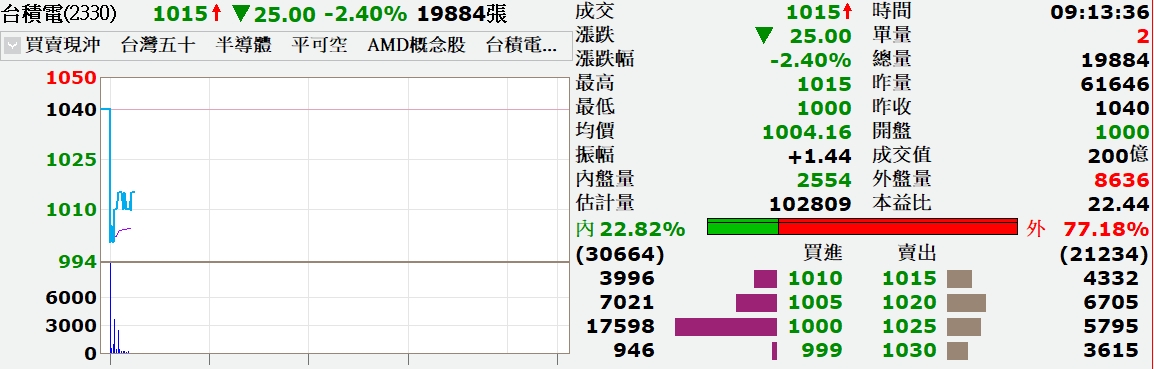電子權值股部分,週末傳出CoWoS砍單消息的台積電(2330)早盤最低下探1000元,跌40元,跌幅近4%,不過隨即出現買單拉抬,早盤最高來到1015元,鴻海(2317)早盤最低下探171.5元,不過隨後出現買單拉抬翻紅,聯發科(2454)則跳空開低,早盤最低下探1485元,跌30元,跌幅近2%。
