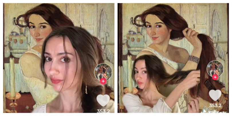 美國22歲網紅日前分享,她的外貌與一幅100多年前的畫作女主角相似,甚至就連髮型、睡衣款式也幾乎一模一樣。(圖/翻攝自TikTok)