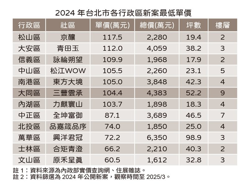 住展雜誌:台北市2024進場新案 7行政區最低單價躍百萬。(住展提供)