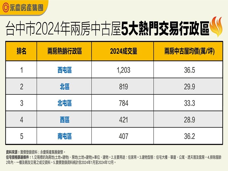 近年來小家庭盛行,考量到總價、性價比,越來越多人選擇兩房作為購屋標的。永慶房產集團根據實價登錄中古屋交易資料,盤點台中市2024年兩房中古屋的5大熱門交易行政區,「西屯區」生活機能便利、重大建設多,交易量位居榜首;「北區」擁有多個重劃區,兩房交易量位居第二;「北屯區」在中國醫藥大學強大剛性需求帶動下,交易量緊追其後、位居第三。