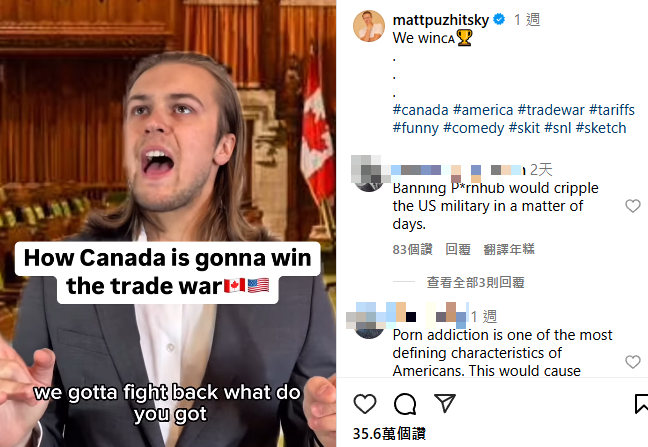 一名多倫多脫口秀演員拍IG短片,開玩笑演示加拿大該怎麼贏下美加貿易戰,並自己破題說是禁止美國人使用Pornhub。(圖/Matthew Puzhitsky IG)