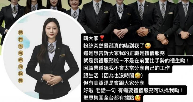 這位正妹禮儀師名叫「瑜萱」,在被該名網友分享後,其IG粉絲數瞬間暴漲,目前已達1.6萬人。對此,她也在IG限時動態中驚訝表示:「嗨大家!粉絲突然暴漲真的嚇到我了,還是想告訴大家我的正職是禮儀服務,就是喪禮服務啦~不是在前面比手勢的禮生呦!」