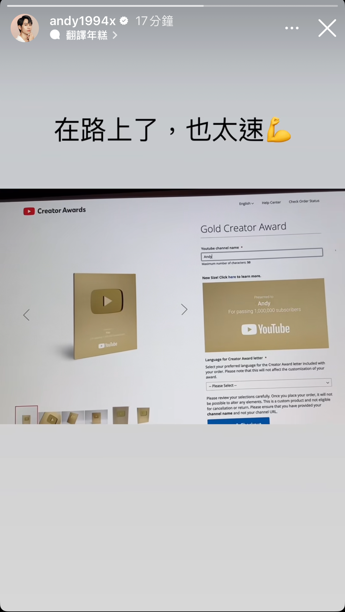 近期YT頻道「眾量級」成員Andy、家寧分手後,因為財務糾紛而開戰場,Andy創立的頻道也漲粉到232萬人。今(20)天上午Andy也在限動表示,自己的YT百萬獎牌已經在路上了。