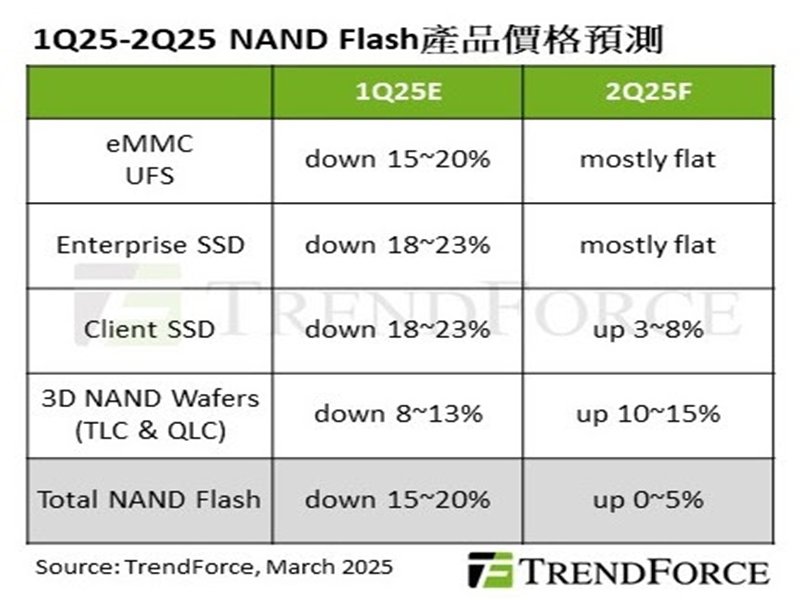 根據TrendForce最新調查,NAND Flash原廠自2024年第四季陸續減產,效應已逐步顯現。此外,消費性電子品牌商因應美國可能提高關稅而提前生產,帶動需求,加上PC、智慧手機和資料中心等應用領域已開始重建庫存,預計2025年第二季NAND Flash價格將止跌回穩,wafer和client SSD價格則是季增。