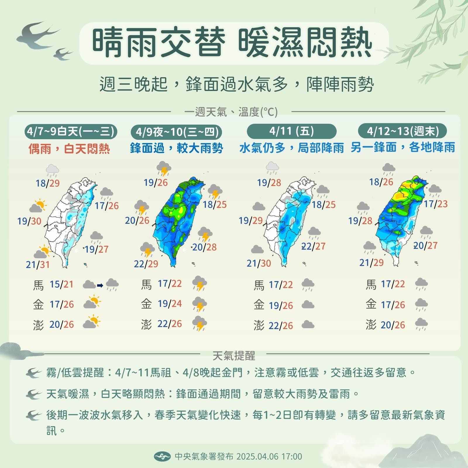 中央氣象署也補充,馬祖地區4/8到4/11、金門4/8晚間起須留意霧或低雲可能影響能見度與交通,留意離島往返交通動態;週三後鋒面接連影響,一波波水氣移入,天氣變化快,往往1~2天即有轉變,請多留意最新預報資訊。