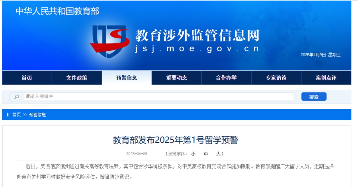 今(9)日晚間,中國教育部發布2025年01號留學預警,表示,「近日,美國俄亥俄州通過有關高等教育法案,其中包含涉華消極條款,對中美高校教育交流合作施加限制。教育部提醒廣大留學人員,近期選擇赴美有關州學習時做好安全風險評估,增強防範意識」。