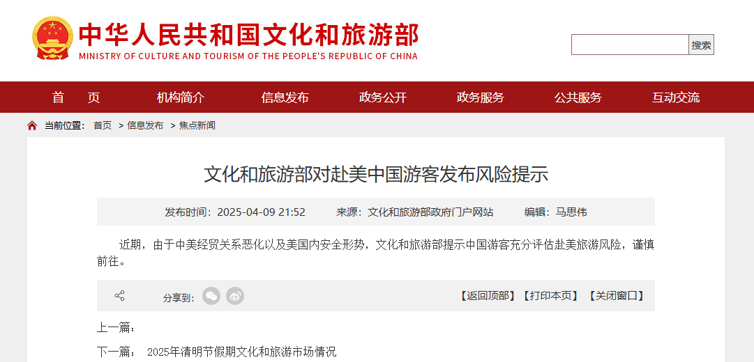 中國文化和旅遊部也發布公告,「近期,由於中美經貿關系惡化以及美國內安全形勢,文化和旅遊部提示中國遊客充分評估赴美旅遊風險,謹慎前往」,提醒民眾近期謹慎評估到美國旅遊的風險。