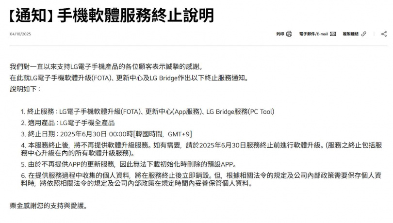 根據LG電子4月10日在官網發布的公告,自2025年6月30日起,LG將停止旗下所有手機的FOTA(無線軟體升級)、更新中心(App服務)以及LG Bridge(電腦端同步工具)等功能支援。屆時,所有使用者將無法再接收系統更新,也無法重新下載出廠時預載卻已被刪除的預設應用App。在提供服務過程中收集的用戶個人資料,也將在服務終止後立即銷毀。但根據相關法令的規定及公司內部政策需要保存個人資料時,將依照相關法令的規定及公司內部政策,在規定時間內妥善保管。