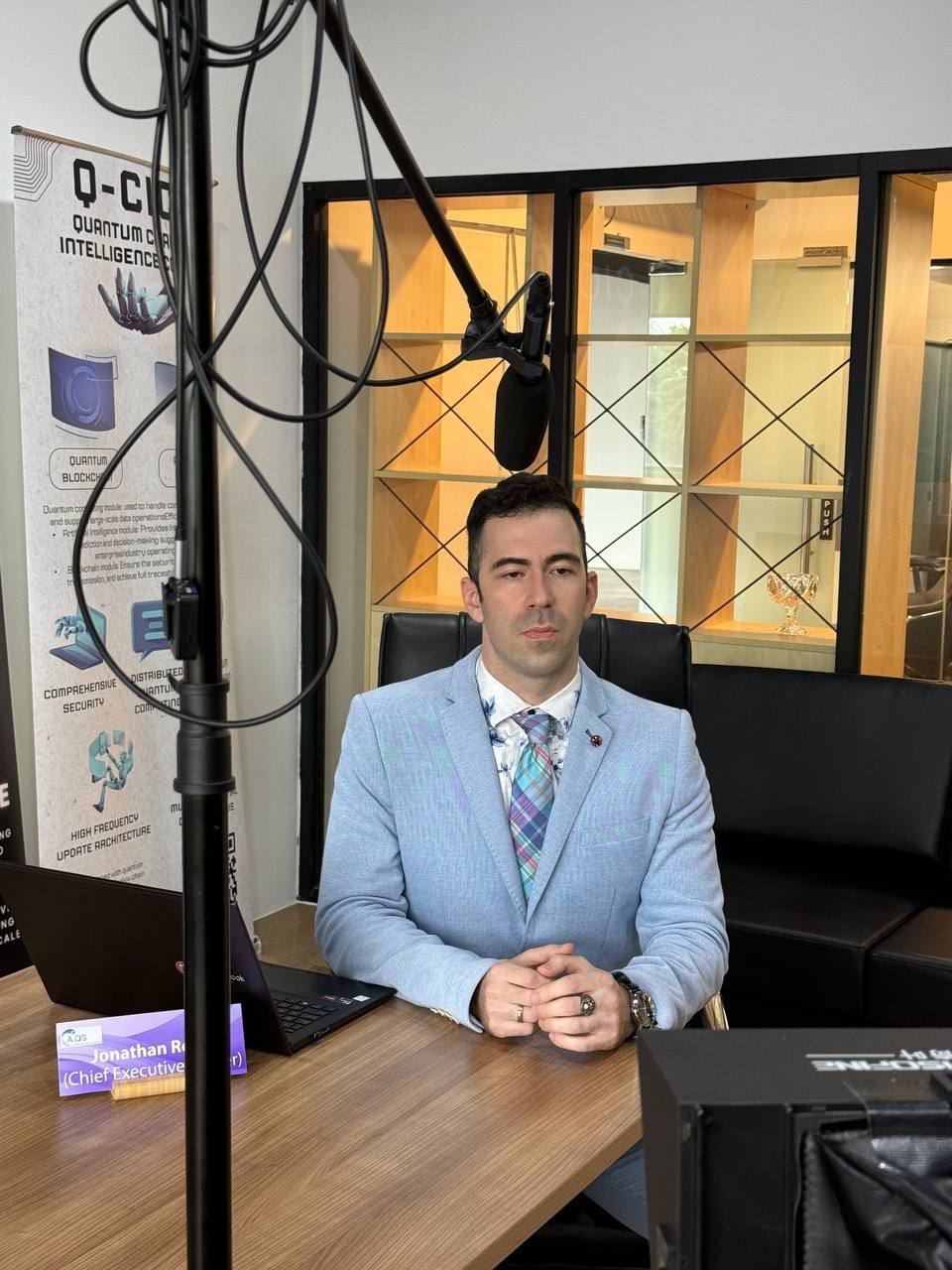 A.QS 首席執行官 Jonathan Reed在主題發表會上展示 Web4 技術與量子鏈智能系統(Q-CIC)的結合應用成果,吸引全球科技與金融專家關注。圖/記者現場拍攝