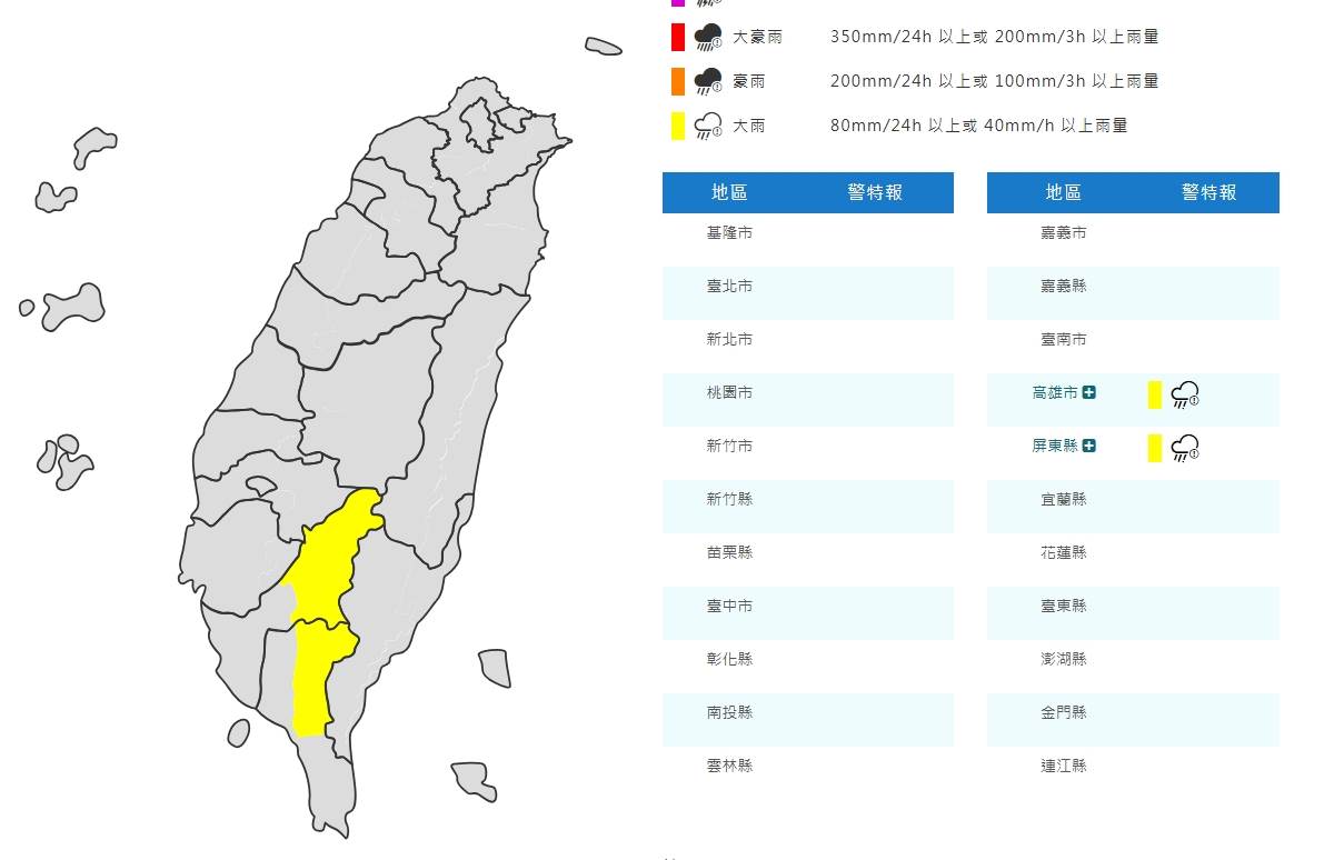 高雄、屏東山區注意大雨。(圖/氣象署)