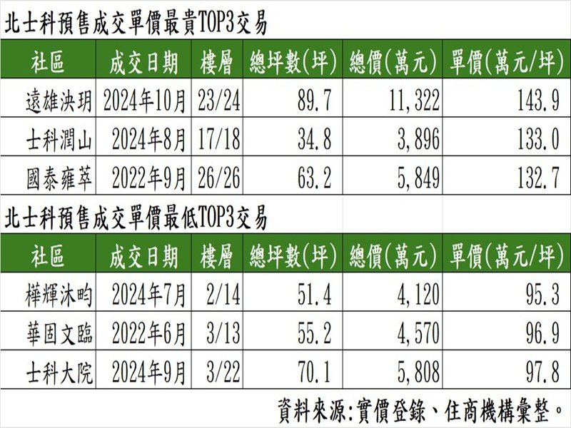 北士科預售成交單價最貴、最低TOP3交易。(住商機構提供)