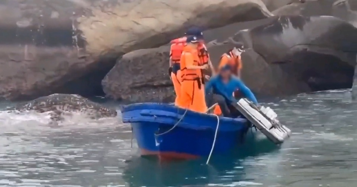 海巡人員拉著藍色上衣的男子,要將他拉上船,帶離海域。海巡人員:「你快點跟他說啦,上去啦!」