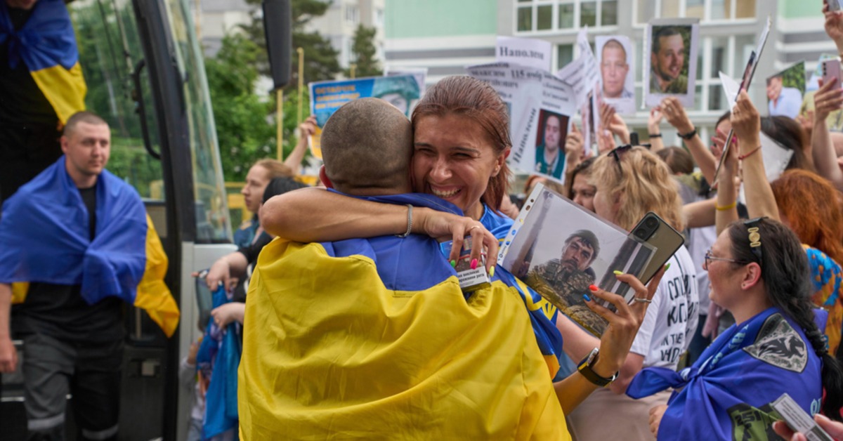 一名女子擁抱從俄羅斯戰俘營歸來的士兵。(圖/美聯社)