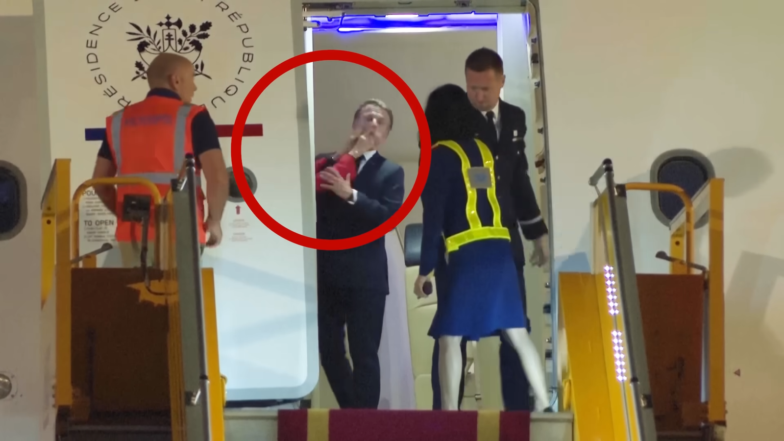 馬克宏夫婦25日抵達越南河內進行訪問,然而下機前在機艙口的這一幕卻掀起網路熱議。畫面可以看到,馬克宏專機落地、架好登機梯時,所有媒體和越南政要早已守候在旁,等待馬克宏夫婦現身,而當機艙門一打開,大家先是看到馬克宏一個人在機艙口,對著身旁還沒有露臉的夫人布里姬像是在說些什麼,沒想到下一幕卻是布里姬伸出手,直接巴向馬克宏的臉,用力一推,力道之猛讓馬克宏不禁倒退2步。