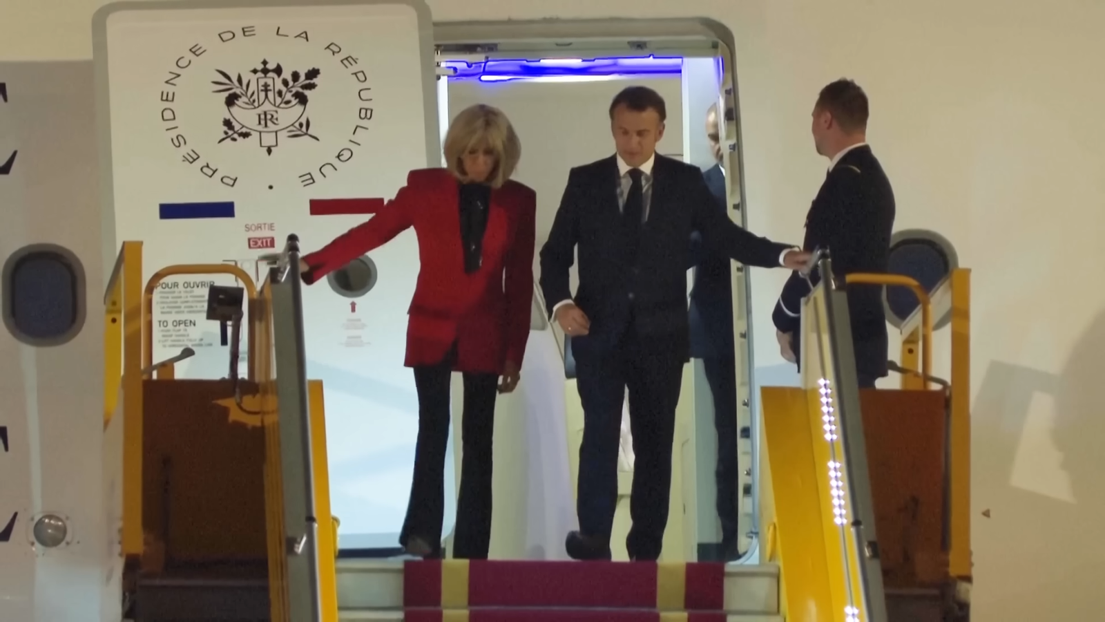 接著馬克宏往前走向夫人的位置,消失在機艙口,不知所為何事,沒過多久夫婦倆才終於一同亮相,走下飛機,雖然臉上表情沒有異狀,但媒體也發現,馬克宏在下機時有意空出右手、要讓夫人可以攙扶著他,但夫人卻看都沒看一眼,逕自伸手抓著登機梯的把手往下走。