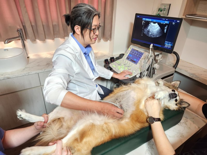 晨動物醫院院長郭力瑋使用高階超音波設備進行寵物腹部檢查,展現康科特旗下的康悅藥品導入醫務管理與設備整合的成果。(康科特提供)