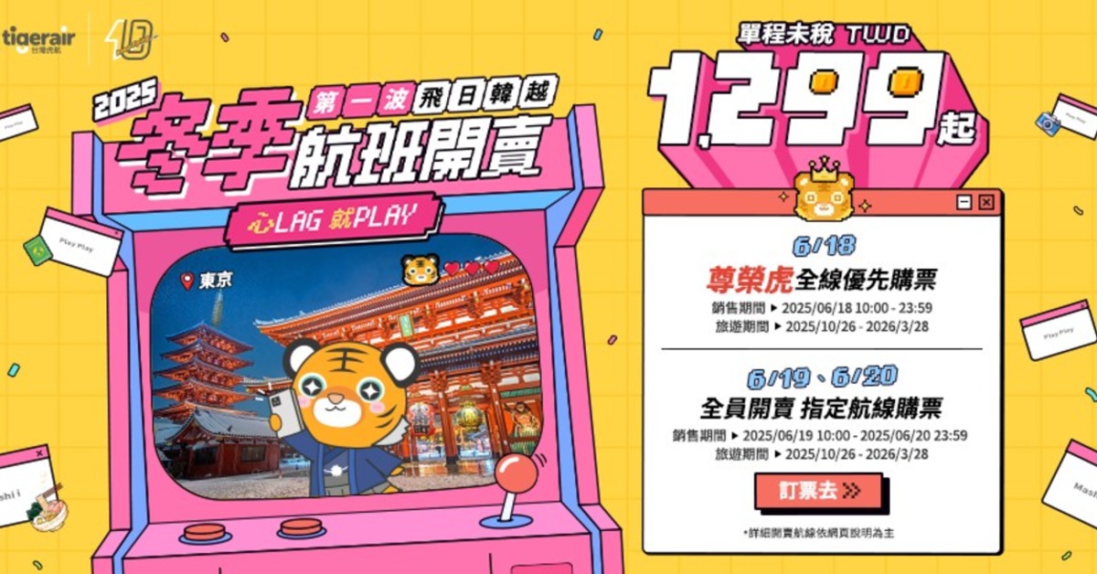 上班累了,那就出國好好犒賞自己吧!台灣虎航宣布2025年冬季航班即將於6月18日上午開賣,首波促銷中,飛韓國最低只要1299起、東京最低1799起,優惠不等人要搶要快!
