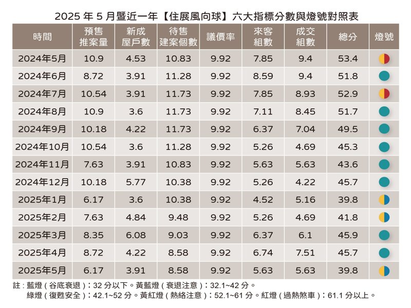 代表北台灣新建案市場概況的「住展風向球」,今年在3月與4月回升穩定綠燈後,5月燈號再次降為代表衰退的黃藍燈,分數是39.8分,六大構成項目呈現「四降、二平」,預售屋推案量、新成屋戶數、成交組數、來客組數下滑,待售建案數、議價率分數持平。