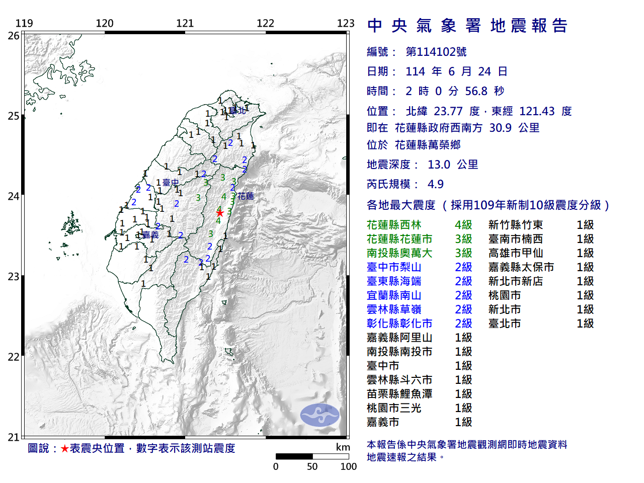 中央氣象署發布顯著有感地震最新消息,今(24)日2時00分,發生芮氏規模4.9有感地震,震央位置在花蓮縣政府西南方 30.9 公里 (位於花蓮縣萬榮鄉),震源深度13.0公里。