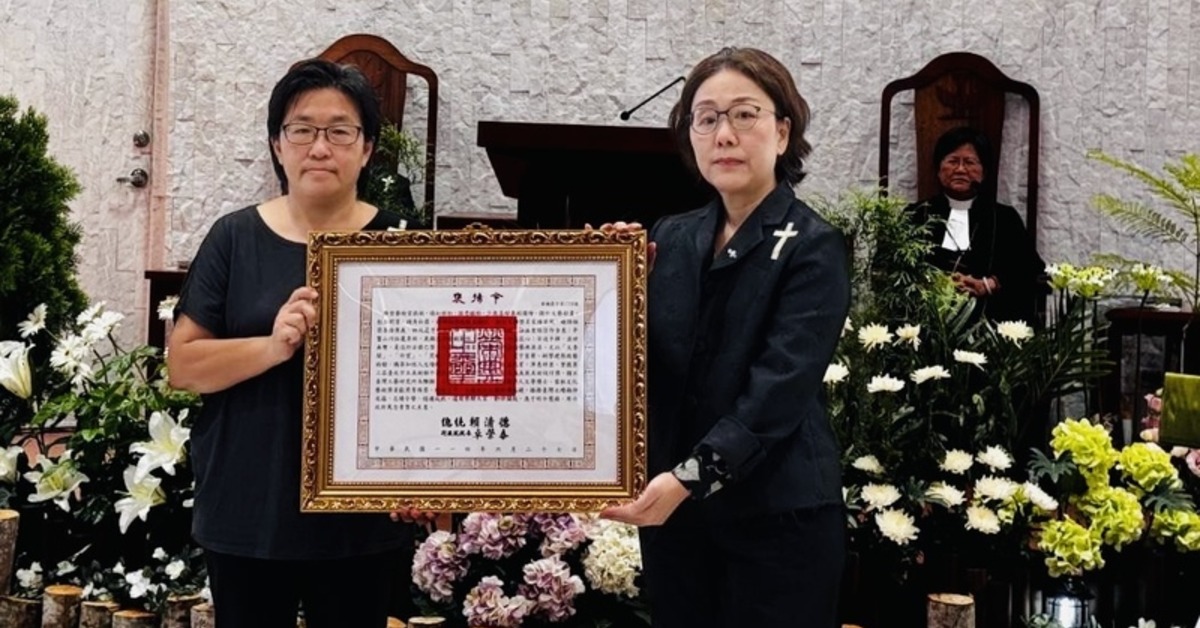 景觀雕刻大師張敬辭世,文化部政務次長王時思(右)28日出席追思感恩禮拜弔唁,並代表頒贈總統褒揚令,由張敬的女兒張平(左)代表家屬受贈。(圖/中央社提供)