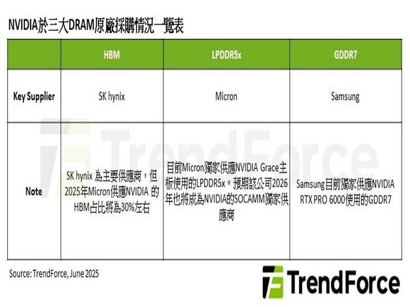 吳雅婷分析,NVIDIA的記憶體採購策略,為針對不同產品類別多元化供應商佈局,高階AI GPU使用的HBM由SK hynix主供、Micron為第二供應商,在LPDDR類別以Micron為主要合作夥伴,GDDR則仰賴Samsung供應。