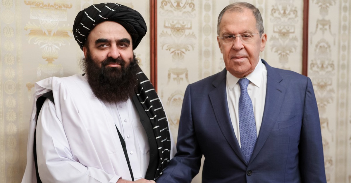 俄羅斯外交部長拉夫羅夫(右)與阿富汗塔利班政權的外交部長穆塔奇(左)。(圖/美聯社)