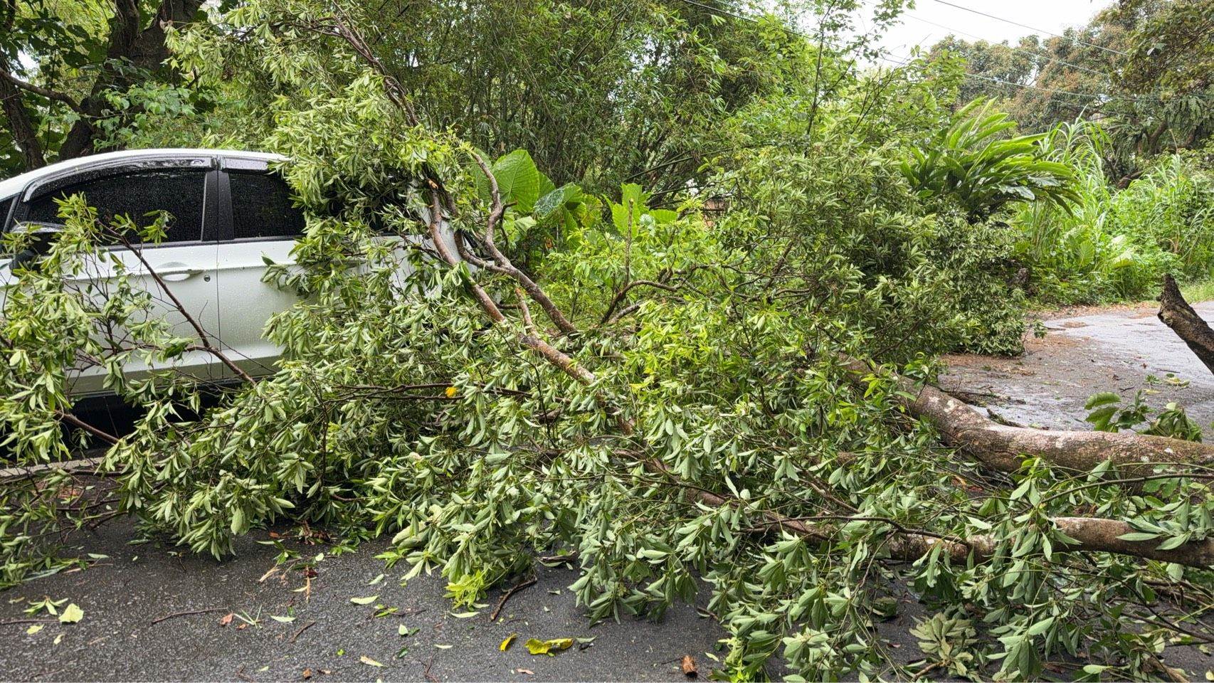 宜蘭礁溪知名的跑馬古道,產業道路2點半左右傳出樹木倒塌,砸到停放路旁的轎車。車主走完步道準備前往開車時,才發現車子被倒塌林木壓住受困,還好無人受傷,目前警消已抵達現場協助,等候清理斷木。