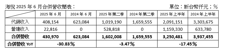 ▼海悅公布6月營收。(圖/海悅提供)