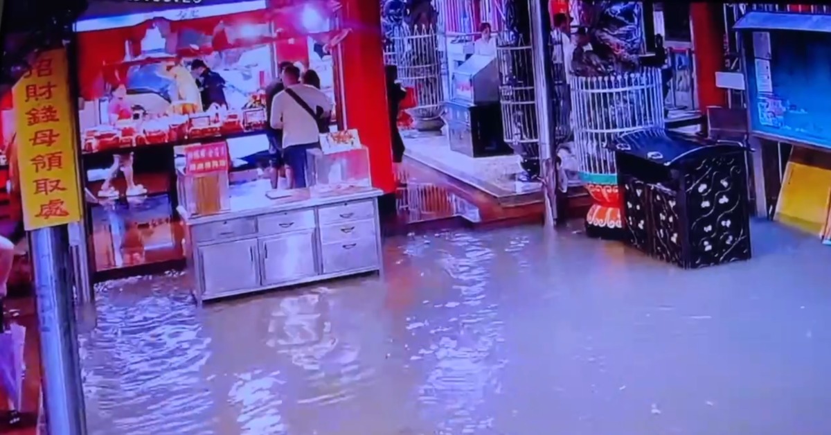 南投竹山鎮的紫南宮,9日中午開始雨勢遽增,不到10分鐘的時間,寺廟旁廣場就淹了將近20公分,經過一小時後就慢慢退去。(圖/東森新聞)
