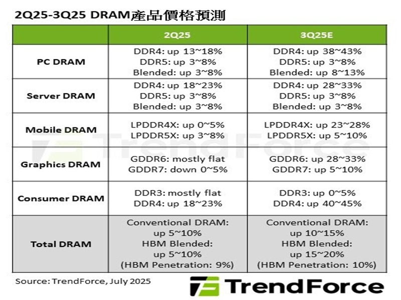 根據TrendForce最新調查,由於三大DRAM原廠將產能轉向高階產品,並陸續宣布PC、server用DDR4和Mobile用LPDDR4X進入產品生命週期末期(EOL),引發市場對舊世代產品積極備貨,加諸傳統旺季備貨動能,將推升2025年第三季一般型DRAM(conventional DRAM)價格季增10%至15%,若加計HBM,整體DRAM漲幅將季增15%至20%。