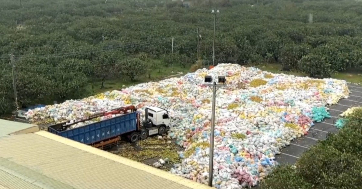 太子宮旁的停車場,在丹娜絲颱風過後,已經變成了文旦的暫時集中場,空拍畫面可以看到,現場麻袋混著文旦,數量多到真的清不完!附近民眾表示,已經連續清了四、五天了,但整個六百坪的停車場,棄置的文旦落果還是非常多。