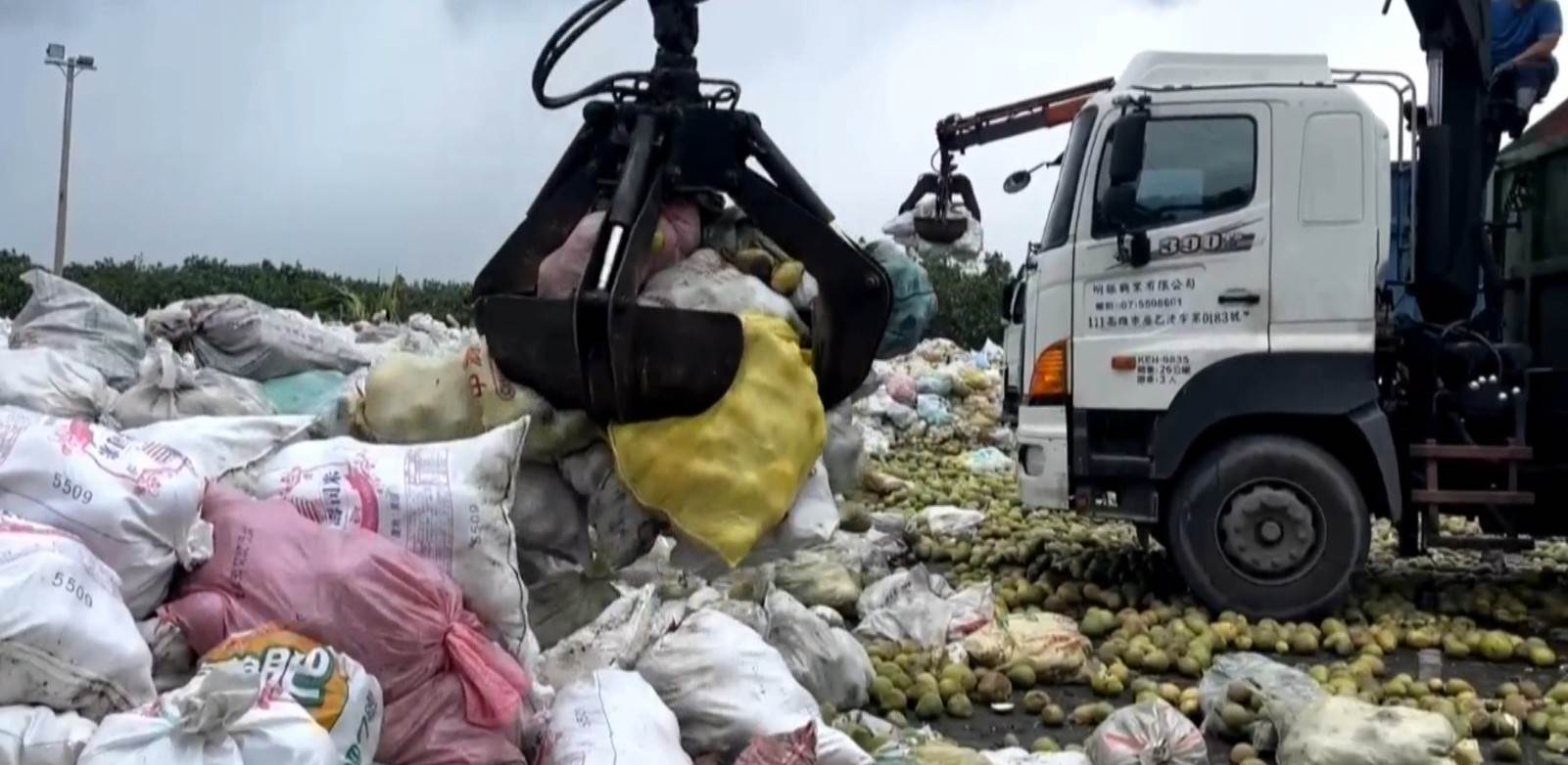 而目急需解決的,就是這些落果的處理問題,因為一下暴雨、一下出太陽,這些暫時堆放在露天停車場的文旦,散發出的惡臭,讓附近的居民相當擔心衛生問題,因此也呼籲,希望能有更多志工來幫忙,盡快將文旦清理完畢。
