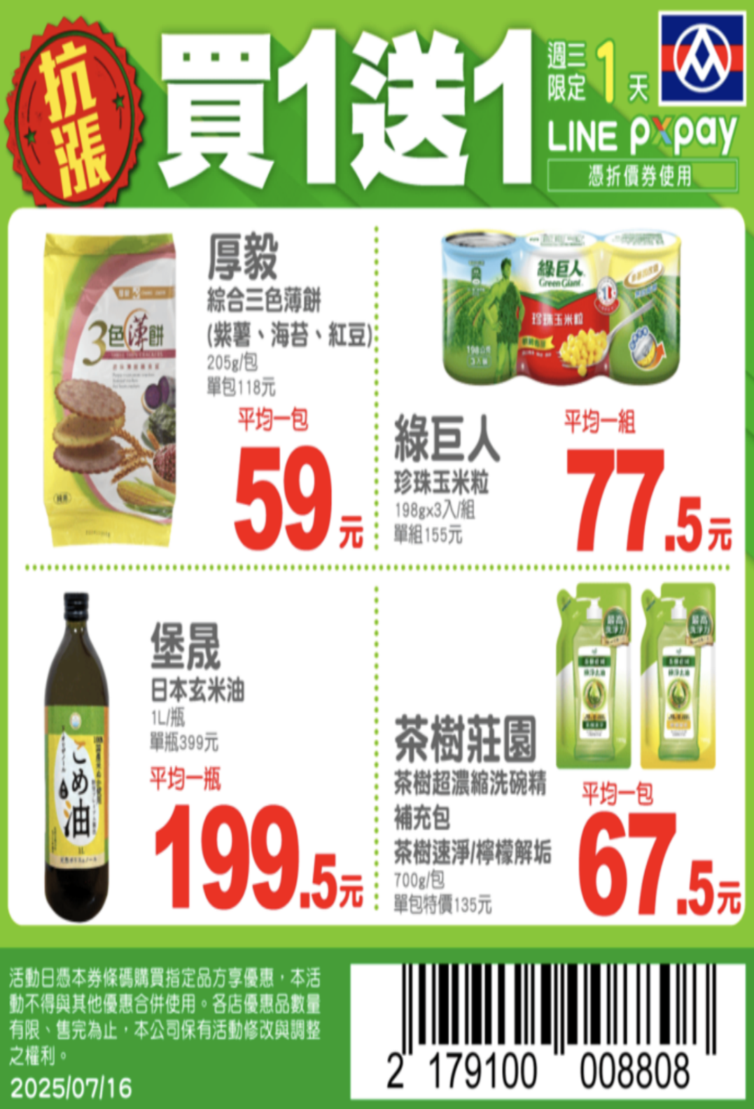 全聯在本月16日推出,週三限定1天「買一送一」,商品有厚毅綜合三色薄片(紫薯/海苔/紅豆)205g/包、綠巨人珍珠玉米粒198g 3入/組、堡晟日式玄米油1L、茶樹莊園超濃縮補充包(茶樹速淨/檸檬解垢)。