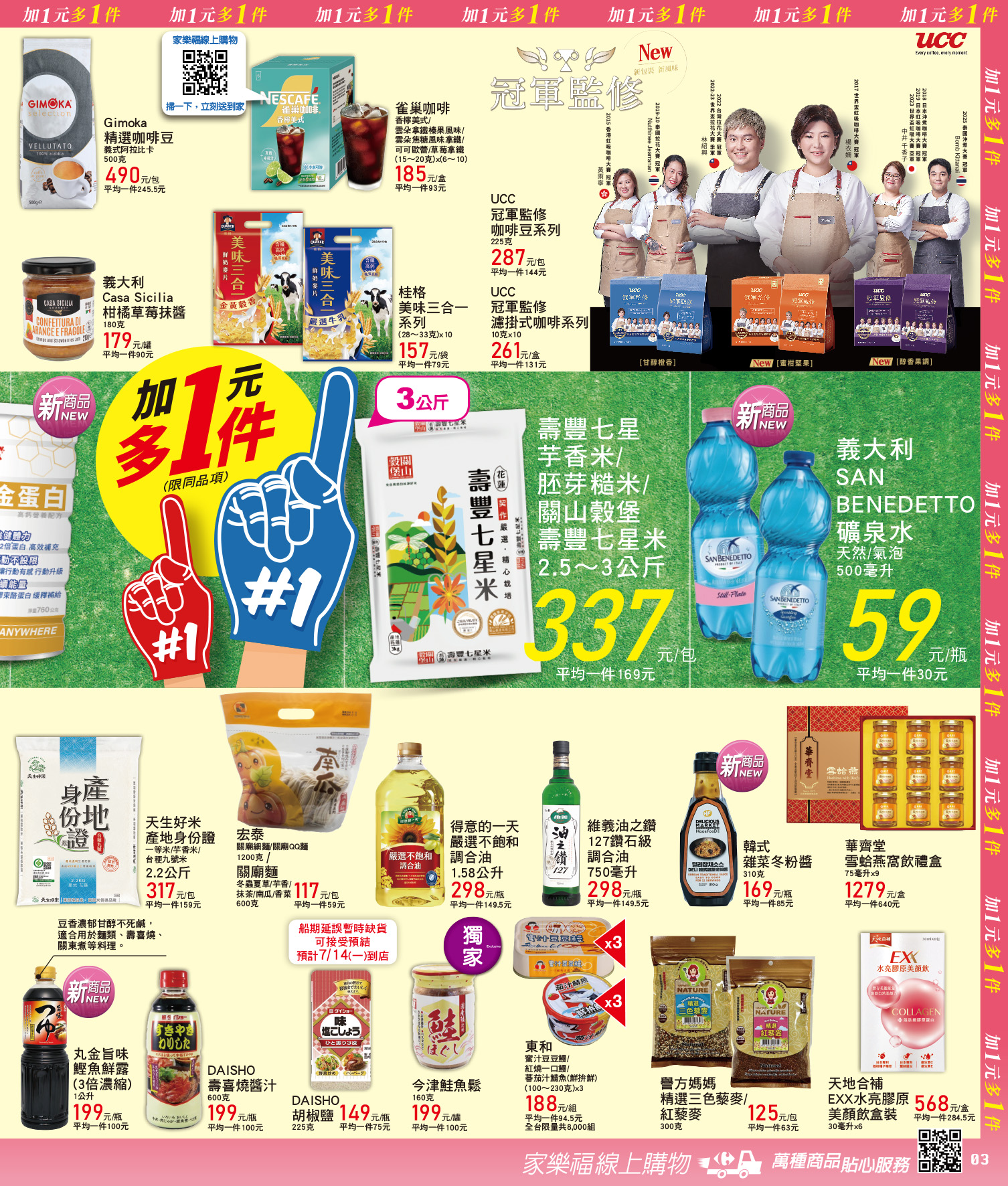 家樂福為因應暑假到來,推出「夏日猛打賞」加1元多1件限時活動,優惠將於7月22日截止,商品包括,Gery厚醬蘇打餅系列100~150g、茱莉詩比利時奶油鬆餅/薄脆餅100g、加倍佳造型酸甜軟糖242g、桂格美味三合一系列28~33g、天生好米產地身分證2.2kg...等等多樣商品。