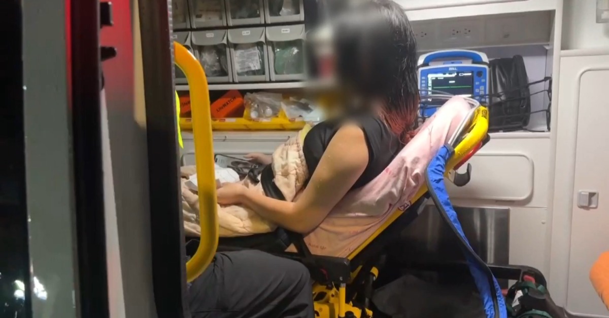 記者vs.路過騎士:「(所以是看到那灘水,來不及就摔倒就對了),對,她好像是騎過來,因為我剛過來路上也沒有看到那個水。」救護人員到場,將摔傷的女騎士送上救護車送醫。