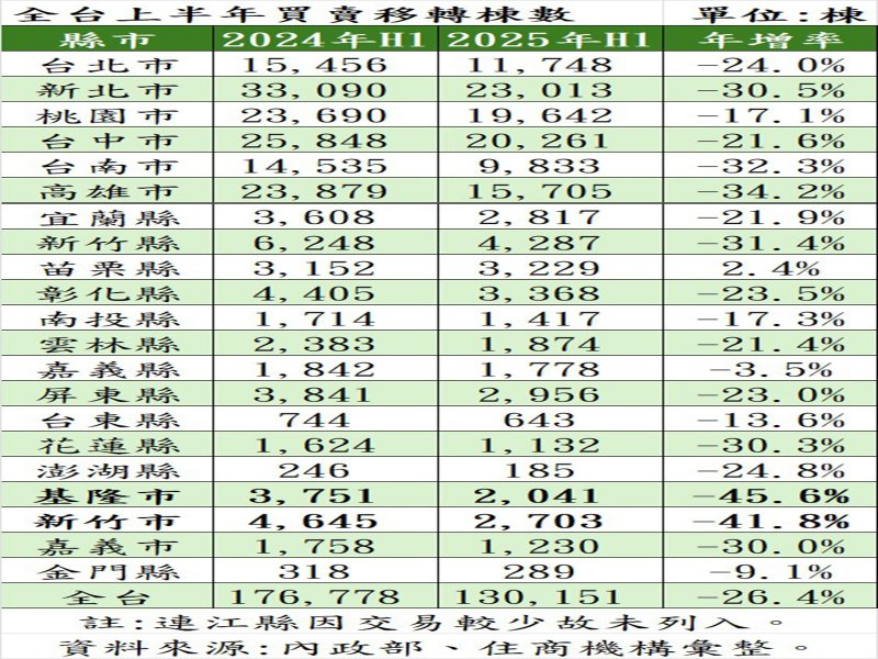 全台受信用管制、限貸令等因素衝擊,上半年買氣大減。住商機構觀察內政部統計,全台上半年買賣移轉棟數相較去年同期大減26.4%,其中尤以基隆市、新竹市跌幅逾四成最多;另觀察自2006年有區域買賣移轉棟數統計以來數據,基隆市、新竹市上半年買賣移轉棟數僅2,041、2,703棟,為2006年以來同期新低。大家房屋企劃研究室公關主任賴志昶分析,兩市近期各有交通建設、科技園區議題,房市炙手可熱,惟受大環境衝擊,區域交易量明顯降溫。
