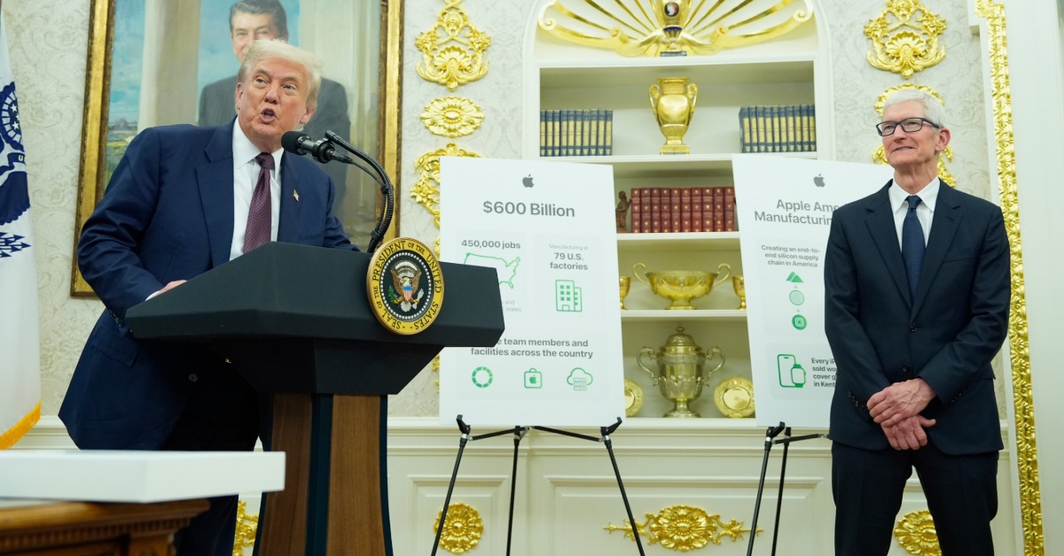 美國總統川普於台灣時間7日清晨5點,在白宮橢圓形辦公室與蘋果執行長庫克(Tim Cook)同框並且宣布,蘋果將在美國投資1000億美元,未來4年總投資金額將達到6000億美元。除了宣布蘋果將在美投資的消息,也一一點名包含台積電在內的各大企業在美投資的金額,總金額突破1兆美元。