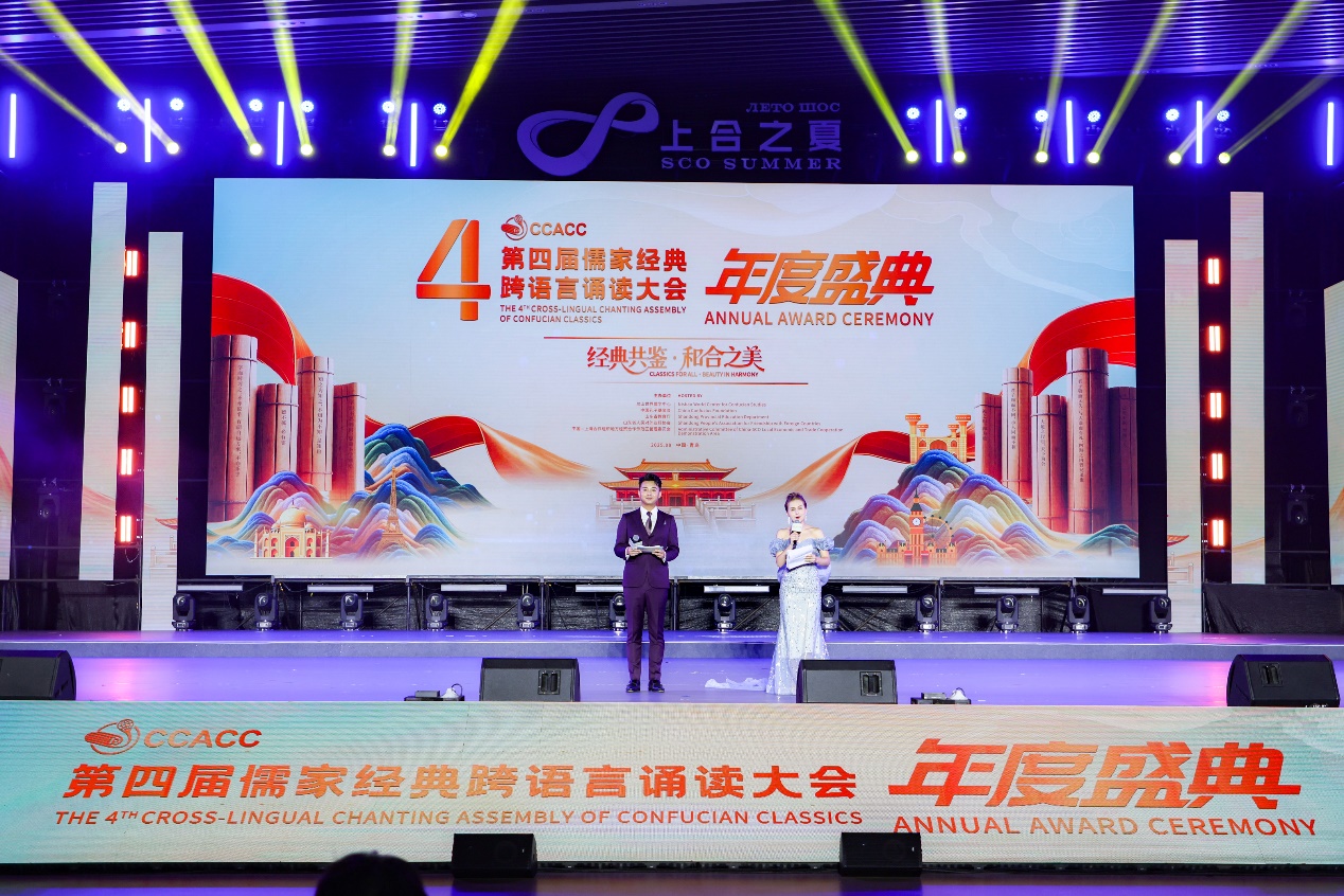 本次盛典以“經典共鑒·和合之美”為主題,在原創話劇《跨越千年的對話》中拉開序幕,通過《天地仁和》《朋自遠方》《和合天下》三個篇章,深度解讀儒家經典的永恆魅力,演繹詮釋“和合”文化的豐富內涵。活動巧妙融入上海合作組織成員國文化元素,亮點紛呈。身著10餘國民族服飾的小演員共同唱響經典民歌《茉莉花》,來自4個國家的青年代表用各自母語誦讀“明月”詩篇,歌舞《相親相愛》以中、英、俄等6國語言傾情演繹,為觀眾呈現了一場視聽盛宴。